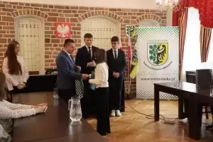 Prezydium Młodzieżowej Rady Miejskiej, na czele z Przewodniczącym Jakubem Fedoszczakiem, podziękowało uczestnikom za udział w konkursie i wspólnie z burmistrzem Adamem Rucińskim wręczyli nagrody i dyplomy za udział w konkursie.