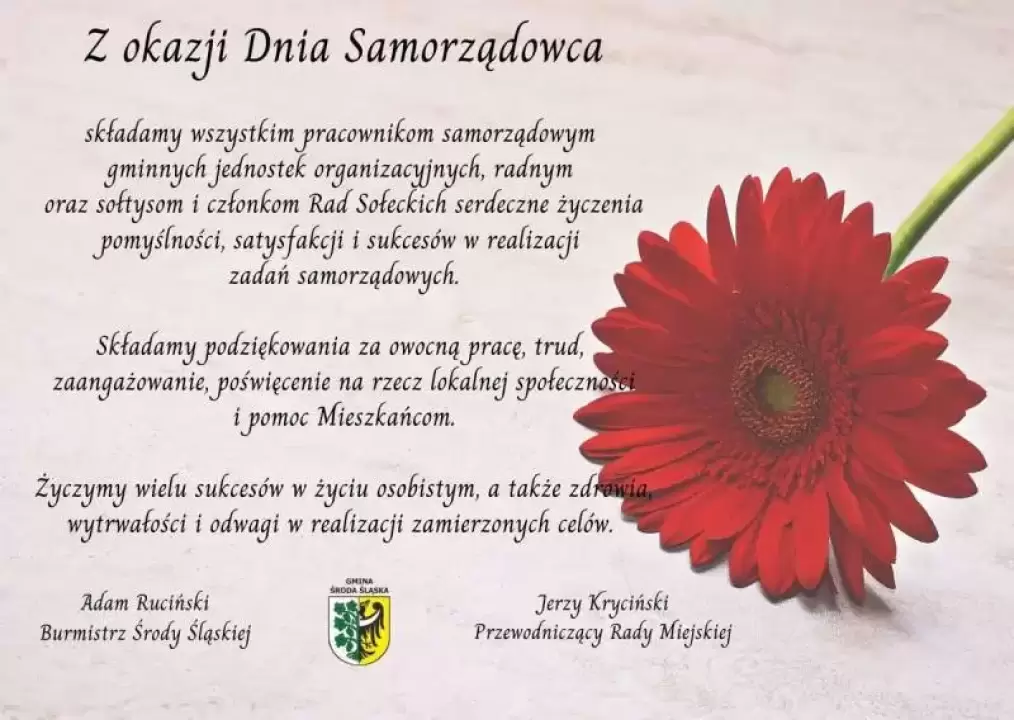 Serdeczne życzenia z okazji Dnia Samorządowca składają Burmistrz Środy Śląskiej i Przewodniczący Rady Miejskiej .