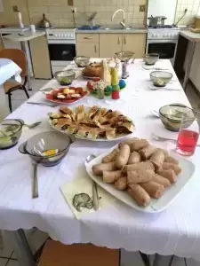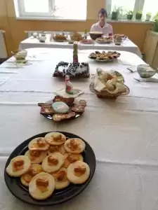 Na odświętnie udekorowanych stołach nie zabrakło tradycyjnych wielkanocnych specjałów: wielkanocnego baranka, kraszanek, żurku z białą kiełbasą, zapiekanych parówek na kruchym cieście, sałatek warzywnych oraz słodkości - kajmakowego mazurka, lukrowanej babki wielkanocnej, makowca na cieście francuskim, czekoladowych zajączków, cukrowych baranków, ciasteczek zdobionych lukrem, glazurą i czekoladą. Wszystkie potrawy przygotowali członkowie koła pod czujnym okiem opiekunów - pani Ewy i pana Pawła.
