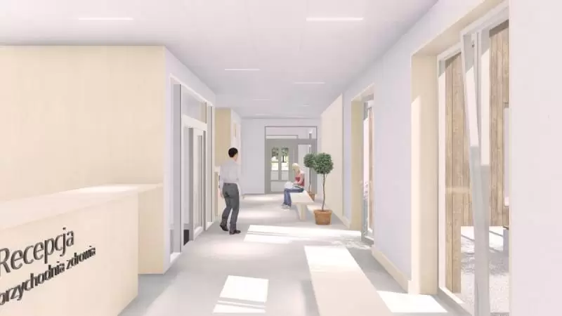 W części pełniącej funkcję ośrodka zdrowia znajdą się m.in. gabinety lekarskie, gabinet diagnostyczny (USG, EKG, KTG itp.), gabinet konsultacyjny specjalistyczny (m.in. kardiolog i neurolog), gabinet stomatologiczny, pracownia rehabilitacyjna, część przeznaczona dla dzieci zdrowych i punkt szczepień.