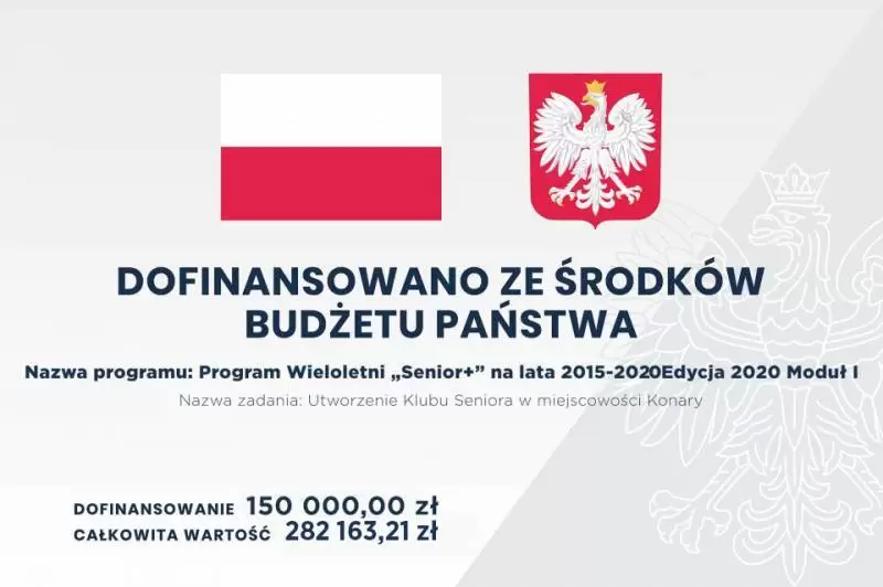 Klub Seniora w Konarach powstał w ramach dotacji pozyskanej przez Gminę Udanin z Programu Wieloletniego „Senior+” na lata 2015-2020 Edycja 2020 Moduł I. Gmina Udanin corocznie pozyskuje środki z programu na funkcjonowanie placówki. Wszystko z myślą o stworzeniu ciekawej oferty dla naszych seniorów.