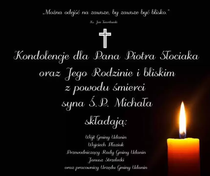 Wójt Gminy Udanin Wojciech Płaziuk, Przewodniczący Rady Gminy Udanin Janusz Strzelecki oraz pracownicy Urzędu Gminy Udanin, składają kondolencje i wyrazy głębokiego współczucia dla Pana Piotra Słociaka oraz Jego Rodzinie i bliskim, z powodu śmierci syna.