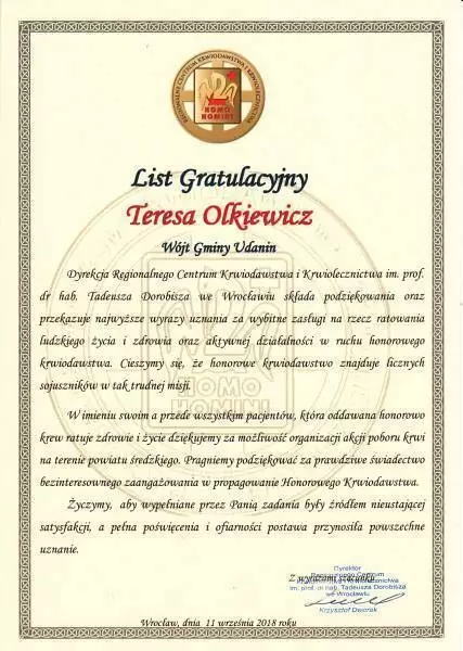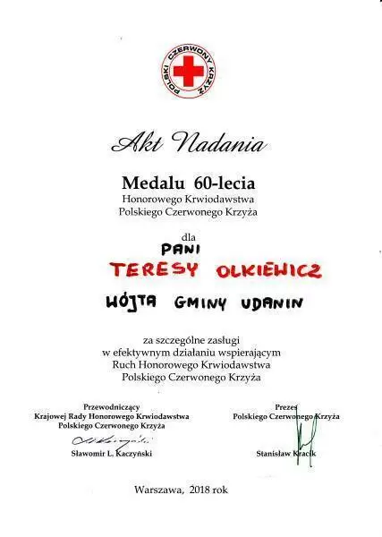Wśród uhonorowanych była pani wójt Teresa Olkiewicz, która otrzymała Akt Nadania Medalu 60-lecia Honorowego Krwiodawstwa Polskiego Czerwonego Krzyża za szczególne zasługi w efektywnym działaniu wspierającym Ruch Honorowego Krwiodawstwa PCK. Na ręce pani wójt został także wręczony List Gratulacyjny Dyrektora Regionalnego Centrum Krwiodawstwa i Krwiolecznictwa im. prof. dr hab. Tadeusza Dorobisza we Wrocławiu Pana Krzysztofa Dworaka.