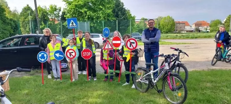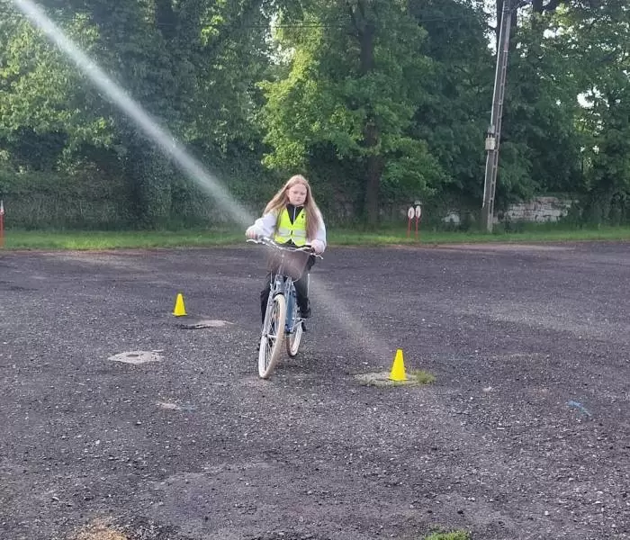 Dodatkowo, każdy kursant musiał zaliczyć szkolenie z pierwszej pomocy przedmedycznej pod okiem pani Moniki Cieślickiej, co pozwoliło na zdobycie niezbędnych umiejętności ratunkowych. Ostatnim etapem był egzamin praktyczny z jazdy na rowerze, przeprowadzony na placu manewrowym na boisku gminnym przez panią Violettę Leńską i pana Rafała Szulińskiego. Po złożeniu odpowiednich dokumentów w sekretariacie szkoły, uczniowie otrzymają Kartę Rowerową, która uprawnia do samodzielnego poruszania się rowerem po drogach.