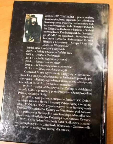 Pani Halina przedstawiła zebranym również krótki życiorys artysty: - Korzystając z możliwości pragnę Państwu przedstawić niecodziennego artystę tej ziemi. Bowiem nieopodal Udanina, w Ujeździe Górnym, Zbigniew Ciesielski urodził się i dorastał. To tu toczyło się jego życie zawodowe oraz rodzinne, gdzie przez wiele lat był organistą oraz kierownikiem zespołu muzycznego „Flamingo” działającego pod patronatem Domu Kultury w Środzie Śląskiej. To przecież tu, na tej Ziemi, w jego małej Ojczyźnie powstawał wielki świat jego wyobraźni. Z biegiem lat artysta podjął lot w stronę wyższych rejonów sztuki. Posłuchajmy proszę, co mówi o nim w przemowie do zbiorku „W Labiryncie czasu i przestrzeni„ ksiądz profesor Joseph Kozłowski z Francji: – Dziękuję Zbigniewowi Ciesielskiemu za jego poezję, która pomogła mi, filozofowi, teologowi, odkryć na nowo jeszcze głębiej wielkość i znaczenie słowa mówionego, pisanego i wyrażanego w jego twórczości.