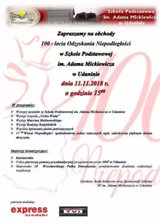Dyrektor, Rada Rodziców oraz Społeczność Szkolna zapraszają 11 listopada na uroczystość upamiętnienia Odzyskania Niepodległości przez Polskę do Szkoły Podstawowej im. Adama Mickiewicza w Udanie.
