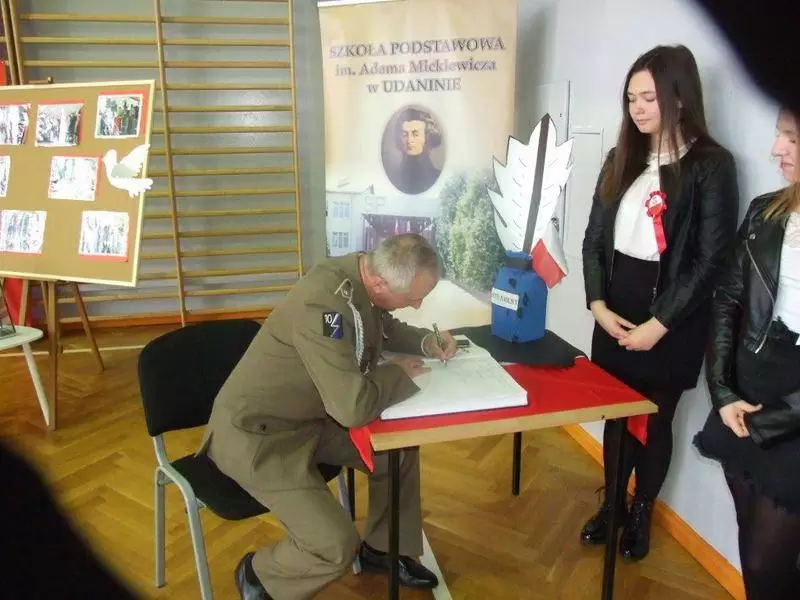 Dyrekcja oraz społeczność szkolna serdecznie dziękują wszystkim, którzy przybyli na uroczystość i zechcieli razem z dziećmi tworzyć współczesną historię, w której nigdy nie powinno zabraknąć miejsca i pamięci o polskich patriotach walczących o wolność naszego kraju. Dziękują w szczególności przybyłym gościom: reprezentantom powiatu średzkiego: wicestaroście Sebastianowi Burdzemu i Grzegorzowi Pierzchalskiemu, wójtowi gminy Udanin Wojciechowi Płaziukowi, ks. Markowi Jodko, radnym powiatowym i gminnym, przedstawicielowi 10 Wrocławskiego Pułku Dowodzenia Tomaszowi Jurkowi, Radzie Rodziców, przedstawicielom bibliotek gminnych, Alfredowi Kielochowi, Marcinowi Malinowskiemu, druhom z OSP Udanin, OSP Jarosław i policji w Środzie Śląskiej za zapewnienie bezpiecznego marszu, mieszkańcom Udanina za przybycie i wspólne świętowanie oraz Monice Cieślickiej, nauczycielom i pracownikom szkoły za przygotowanie tego, tak ważnego dla społeczności szkolnej i lokalnej święta.