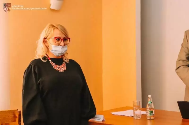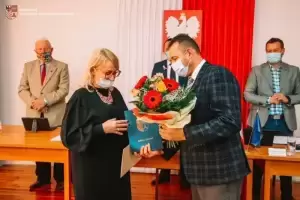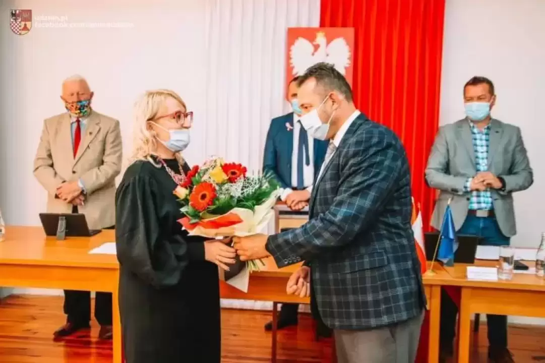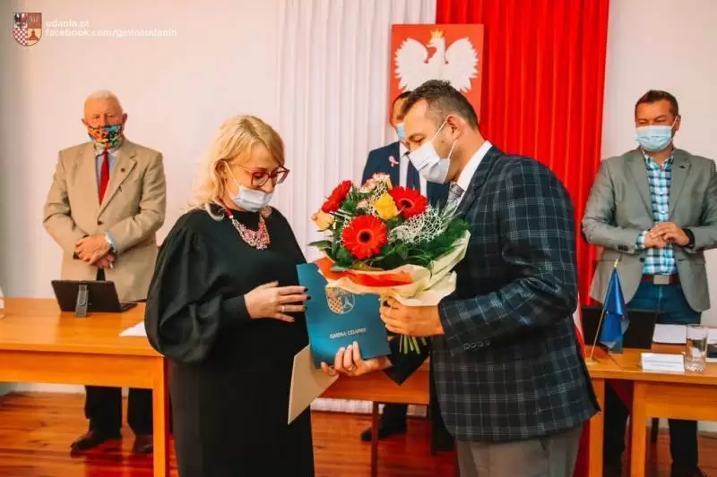 Ślubowanie złożyła Pani Justyna Rosińska-Tłusty, nauczycielka ze Szkoły Podstawowej im. Adama Mickiewicza w Udaninie, która z rąk wójta Wojciecha Płaziuka otrzymała akt nadania stopnia awansu zawodowego oraz bukiet kwiatów.