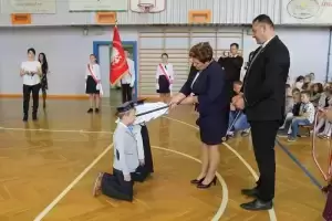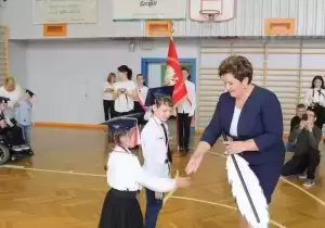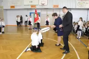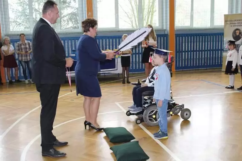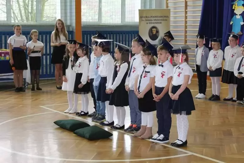 Najważniejszym momentem uroczystości było złożenie przez dzieci uroczystego ślubowania w obecności sztandaru. Po ślubowaniu pani dyrektor Bożena Basa pasowała pierwszoklasistów na uczniów Szkoły Podstawowej im. Adama Mickiewicza w Udaninie.