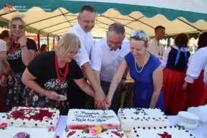 Były wspomnienia, wzruszenia i wspólne śpiewanie pieśni ludowych. Długa kolejka ustawiła się przed sceną, gdzie jubilaci odbierali same ciepłe słowa i okolicznościowe prezenty. Pośrodku części artystycznej przyszedł czas na zaśpiewanie „Sto lat” i skosztowanie pysznego tortu.