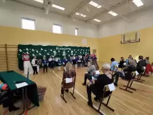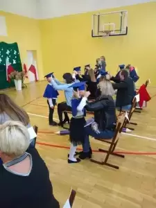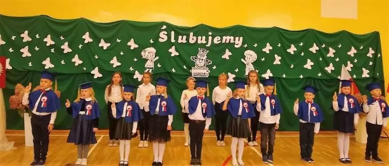 Najpierw odczytano list od dyrektora szkoły p. Doroty Byry, potem miał miejsce krótki występ, a następnie uczniowie klasy I złożyli ślubowanie. Wychowawca p. Justyna Pilarska wspólnie z wójtem dokonali uroczystego aktu pasowania dzieci na uczniów. Towarzyszyła temu podniosła atmosfera, a na buziach dzieci rysowały się wielkie emocje.