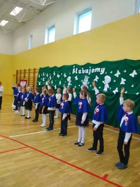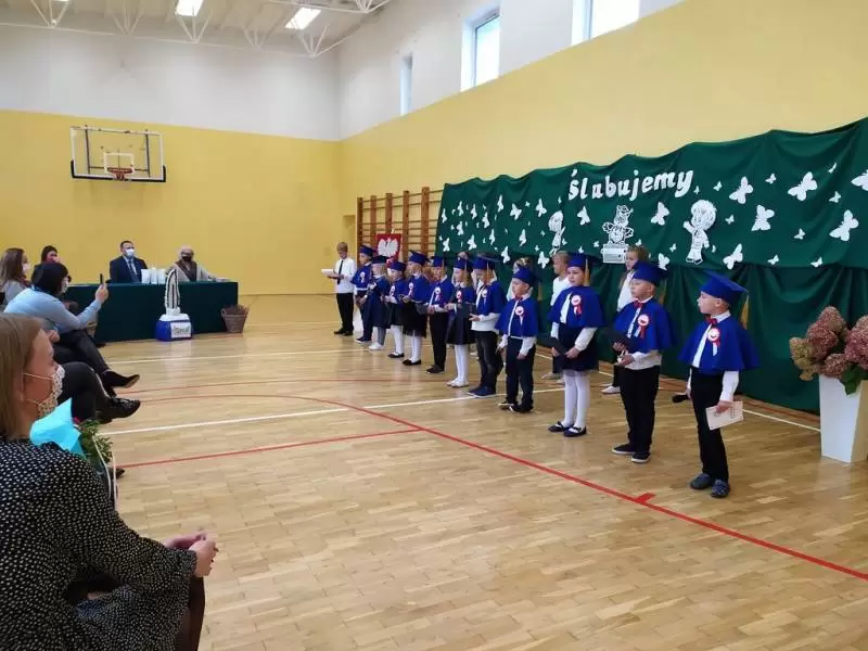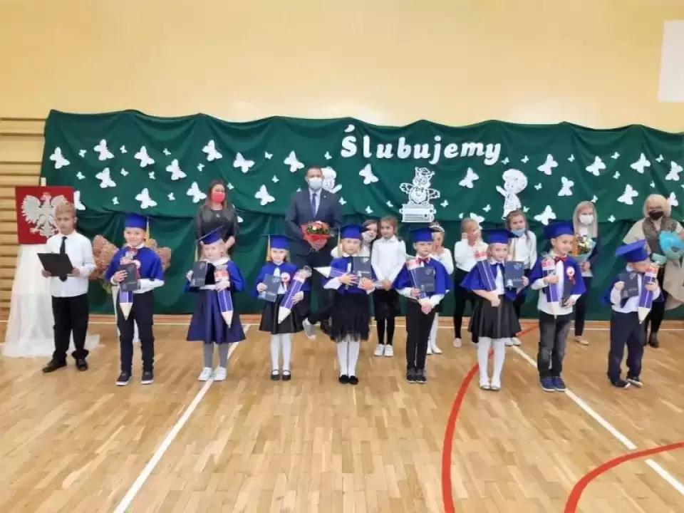 Ślubowanie ze względu na sytuację epidemiologiczną, wyglądało nieco inaczej niż zwykle. Dzieciom nie mogli niestety towarzyszyć uczniowie klas starszych. Nie zmienia to jednak faktu, iż dzień 23 października był dla pierwszoklasistów dniem niezwykłym i bardzo podniosłym.