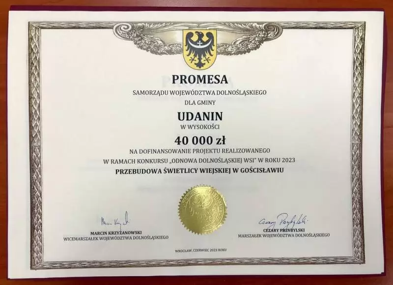 Wójt Gminy Udanin Wojciech Płaziuk odebrał wczoraj z rąk Wicemarszałka Marcina Krzyżanowskiego promesy z dofinansowaniem na kolejne inwestycje.