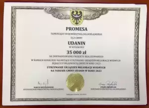- "Utrzymanie urządzeń melioracji wodnych na terenie Gminy Udanin w roku 2023." Zadanie dotyczy konserwacji 435 mb rowu w miejscowości Lusina. Kwota dotacji 35.000,00 zł.