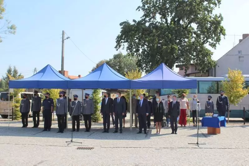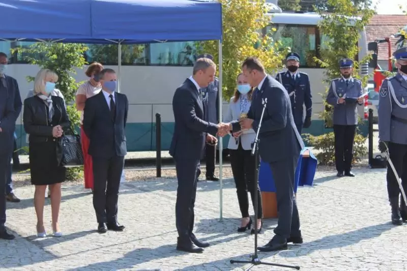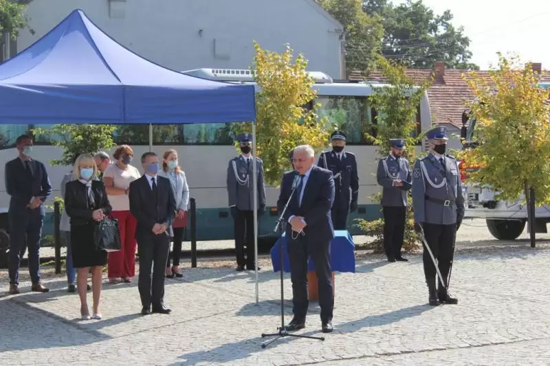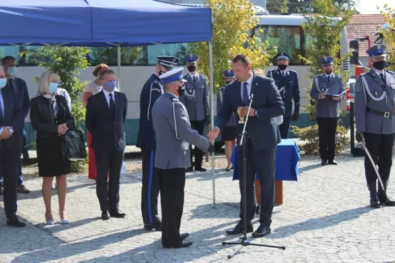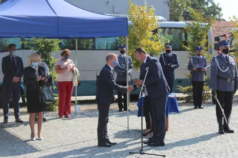 Symboliczny klucz na ręce kierownika Posterunku Policji w Udaninie Marka Bednarza wręczyli poseł na sejm RP Paweł Hreniak, komendant wojewódzki policji we Wrocławiu insp. Dariusz Wesołowski, wicewojewoda dolnośląski Bogusław Szpytma oraz wójt gminy Udanin Wojciech Płaziuk.