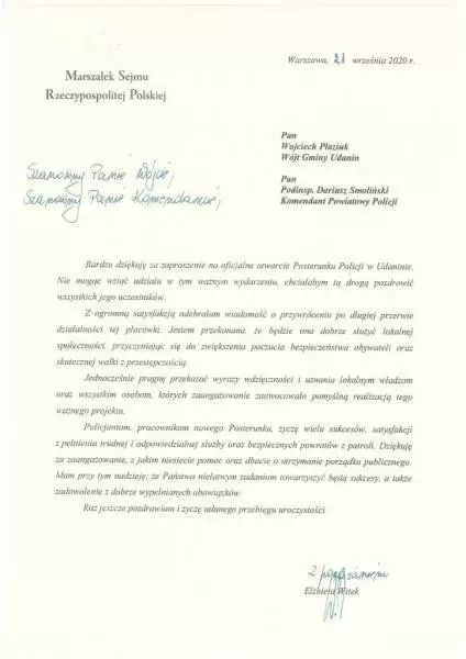 - Po wielu latach od zamknięcia placówki dzisiaj nastąpiło uroczyste przekazanie pomieszczeń oraz symboliczne otwarcie. Było dostojnie i z honorami, tak jak powinno być przy tego typu uroczystościach. Całość projektu to koszt ok. 220 tys. zł, z czego 160 tys. pokryte zostało przez komendę wojewódzką - mówi Wojciech Płaziuk, wójt gminy Udanin. - Dziękuję posłowi Pawłowi Hreniakowi, komendantom wojewódzkim policji oraz komendantowi policji powiatowej. Dziękuję radnym gminy Udanin za pełną aprobatę mojego wniosku podnoszącego poziom bezpieczeństwa na terenie gminy Udanin - podkreśla wójt.