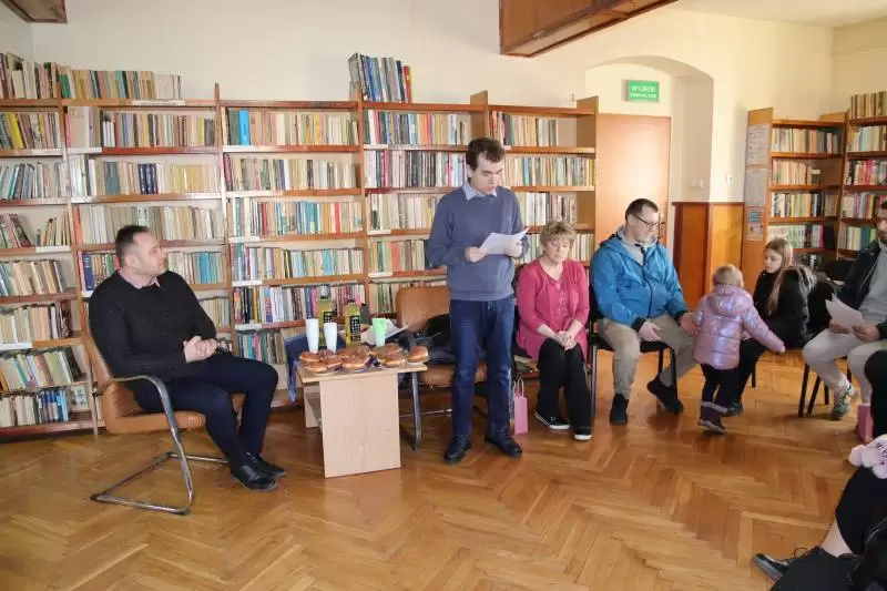 Następnie Wójt z okazji dzisiejszego Tłustego Czwartku poczęstował naszych lokalnych artystów pysznym pączkiem, a każdy uczestnik zaprezentował wiersz zgłoszony w konkursie.