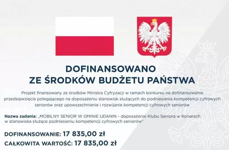 Projekt finansowany ze środków Ministra Cyfryzacji w ramach konkursu na dofinansowanie przedsięwzięcia polegającego na doposażeniu stanowisk służących do podniesienia kompetencji cyfrowych seniorów oraz upowszechnienie i rozwijanie kompetencji cyfrowych seniorów. Wartość zadania wynosi 17 835,00 zł.