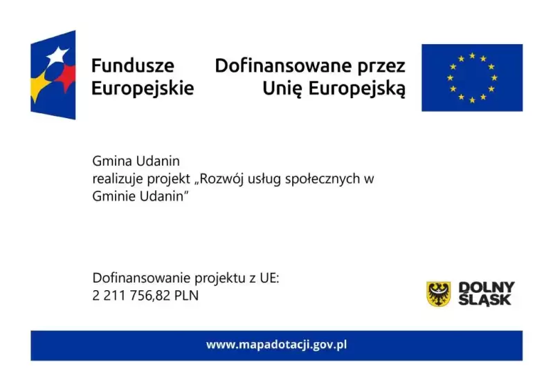 Przedsięwzięcie realizowane jest w ramach projektu pn. „Rozwój usług społecznych w Gminie Udanin”, w ramach Priorytetu nr 7 Fundusze Europejskie na rzecz rynku pracy i włączenia społecznego na Dolnym Śląsku, Działania nr 7.7 Rozwój usług społecznych i zdrowotnych, Programu Fundusze Europejskie dla Dolnego Śląska 2021–2027, współfinansowanego ze środków Europejskiego Funduszu Społecznego Plus (EFS+).