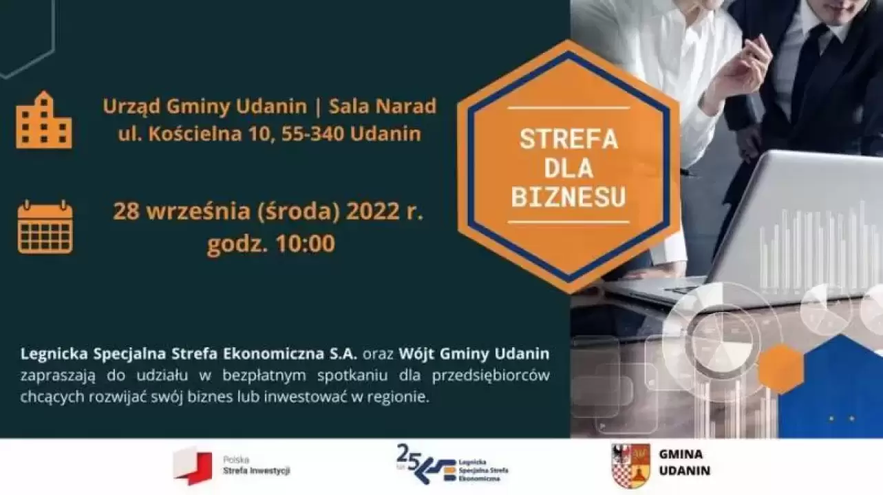 Legnicka Specjalna Strefa Ekonomiczna S.A. oraz Wójt Gminy Udanin Wojciech Płaziuk zapraszają do udziału w bezpłatnym spotkaniu dla przedsiębiorców chcących rozwijać swój biznes lub inwestować w regionie.