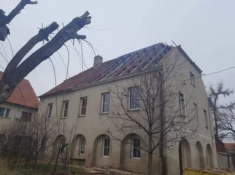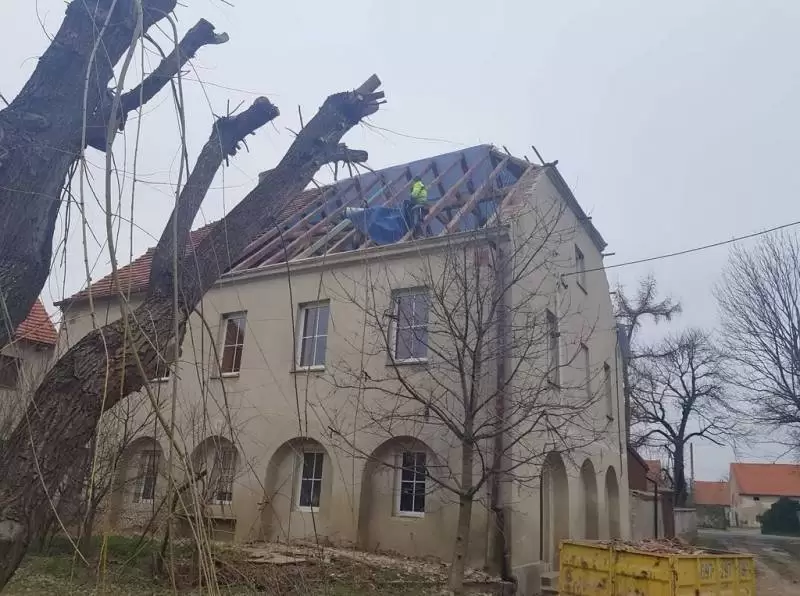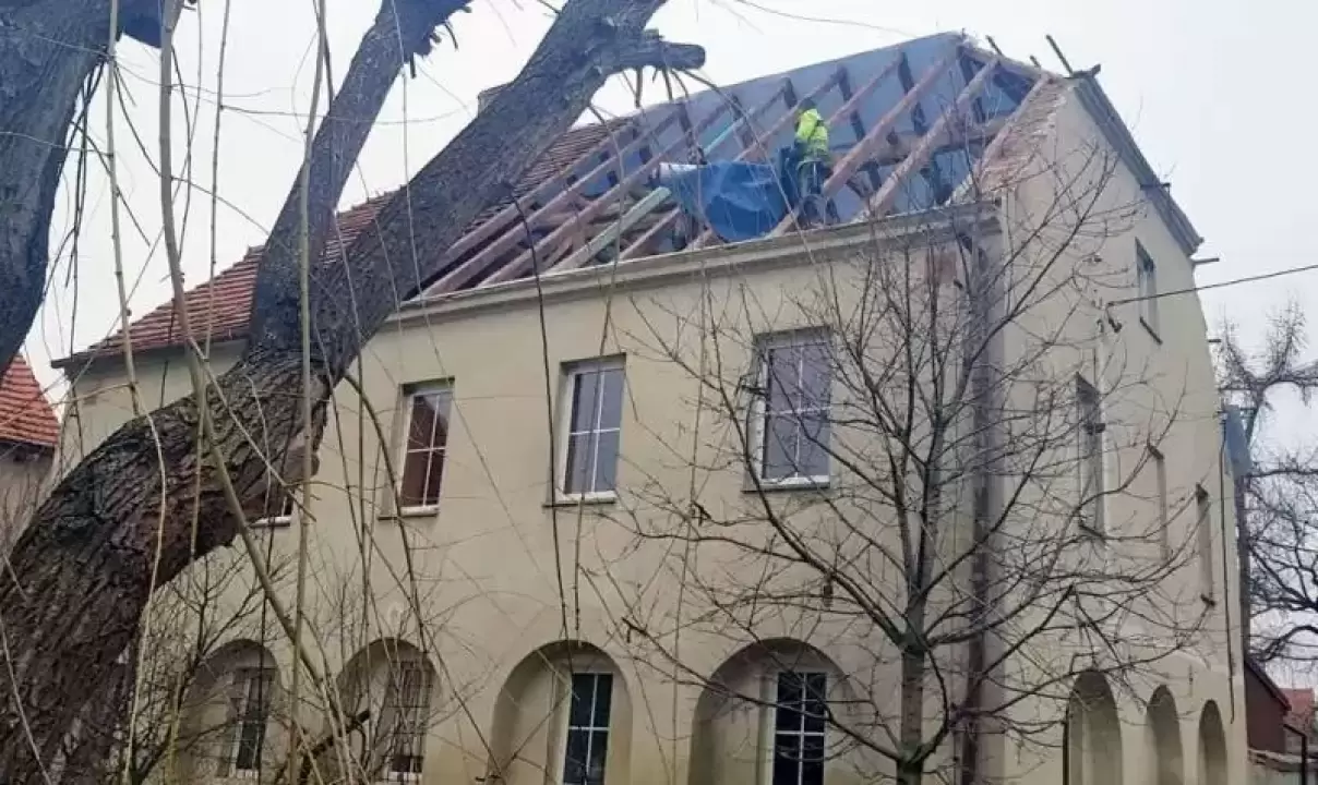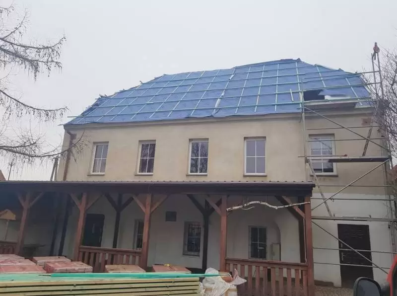 Na budynku świetlicy wiejskiej w Damianowie trwają prace w zakresie wymiany połaci dachowej, przemurowania komina, impregnacji więźby dachowej i montażu instalacji odgromowej.