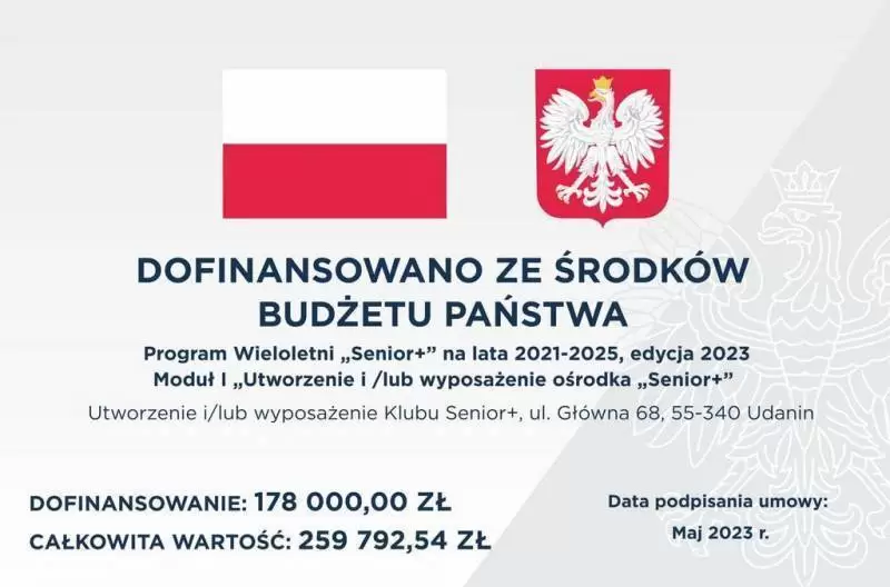 Pod koniec grudnia 2023 r. zakończono wszystkie prace związane z utworzeniem Klubu Seniora w Udaninie. Na ten cel Gmina Udanin pozyskała dotację z budżetu Państwa w wysokości 178 000,00 zł. w ramach Programu Wieloletniego „Senior+” na lata 2021-2025, edycja 2023 Moduł I „Utworzenie i/lub wyposażenie ośrodka „Senior+”.