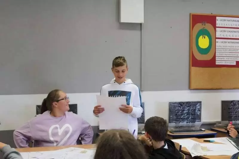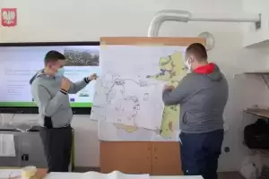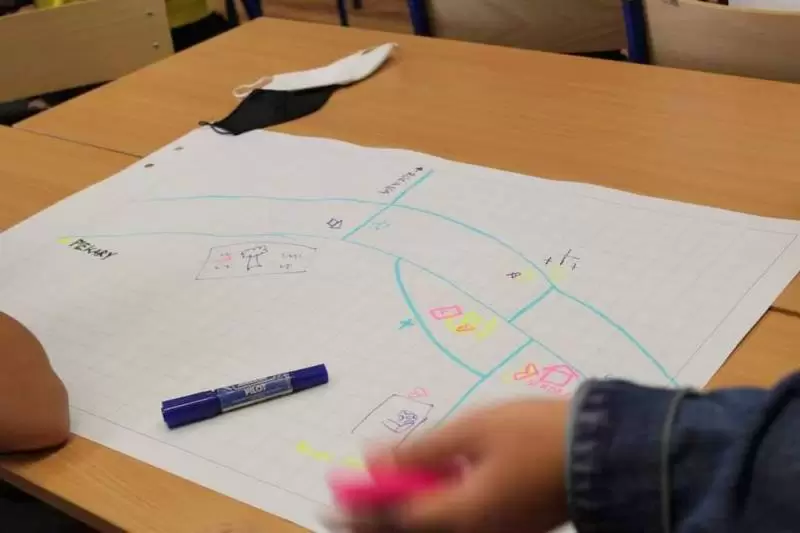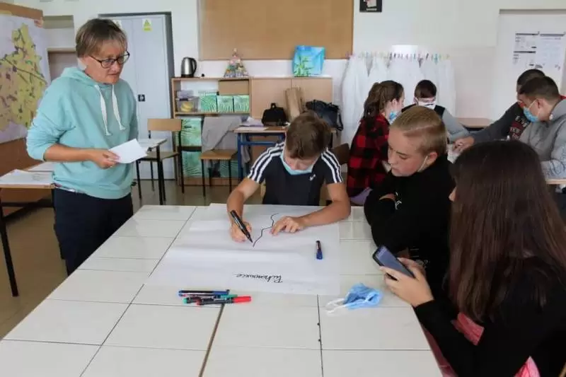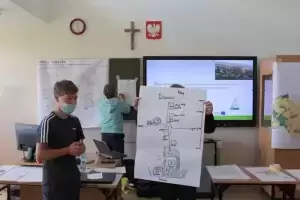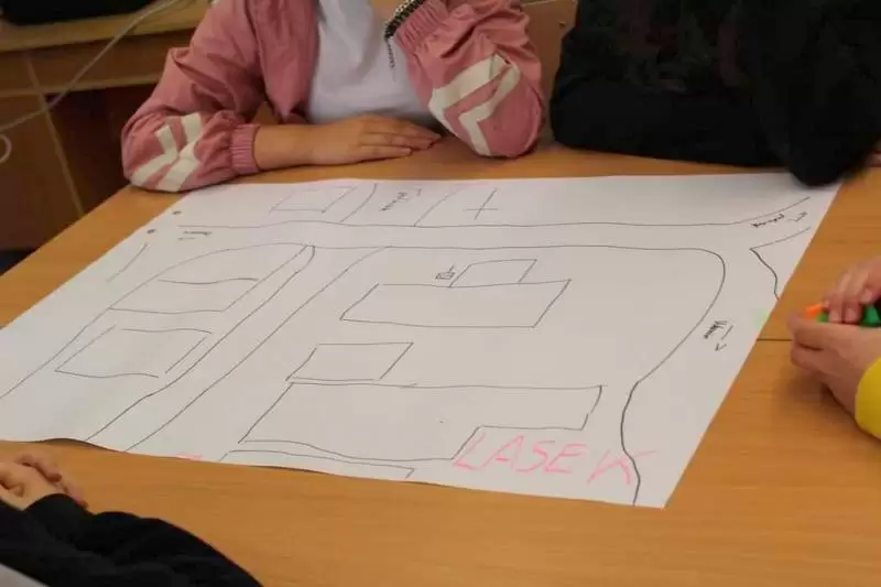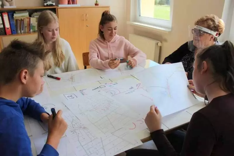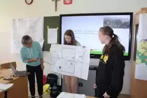 Uczniowie zostali poproszeni o wykonanie na planszy mapki swojej miejscowości z lotu ptaka, mieli zaznaczyć: najważniejsze budynki, kościół, szkołę, plac zabaw, przystanki, parkingi, zadrzewienia. Dodatkowo opisać na planie oznaczenia gdzie jest północ, południe, wschód i zachód.