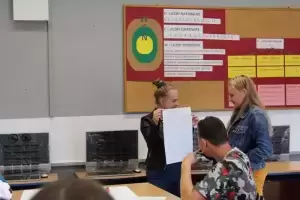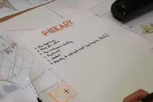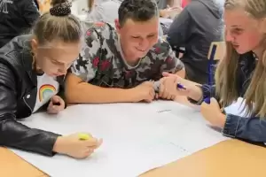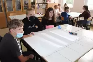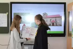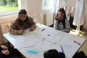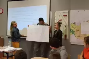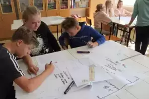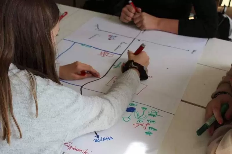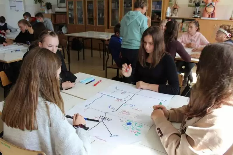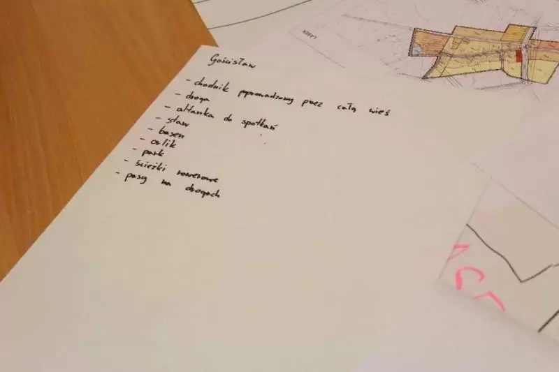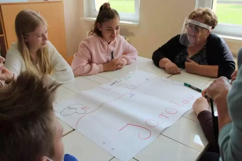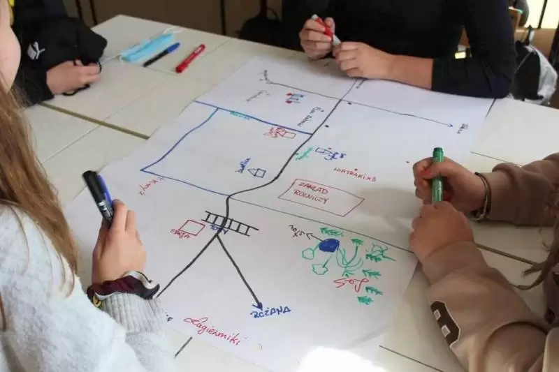 Następnie młodzież zaznaczyła serduszkami miejsca, w których lubią przebywać. Każda grupa podczas krótkiej prezentacji przedstawiła swoją mapkę z lotu ptaka. Uczniowie omówili co powoduje, że zaznaczone miejsca są ich ulubionym? Musieli także się zastanowić jak mają wyglądać zamieszkiwane przez nich wsie, jak również gmina Udanin za 10 lat. Swoje pomysły zaprezentowali całej grupie wraz z uzasadnieniem co powinno się zmienić, aby lepiej się żyło mieszkańcom.