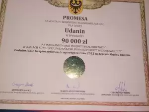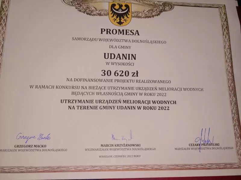 90 tys. zł na podniesienie bezpieczeństwa drogowego z programu ,,Dolnośląskiego Funduszu Pomocy Rozwojowej 2022", 40 tys. zł na wykonanie elewacji w Klubie Seniora w Konarach z programu ,,Odnowa Dolnośląskiej Wsi" i prawie 31 tys. zł na utrzymanie urządzeń melioracyjnych w Gminie Udanin.