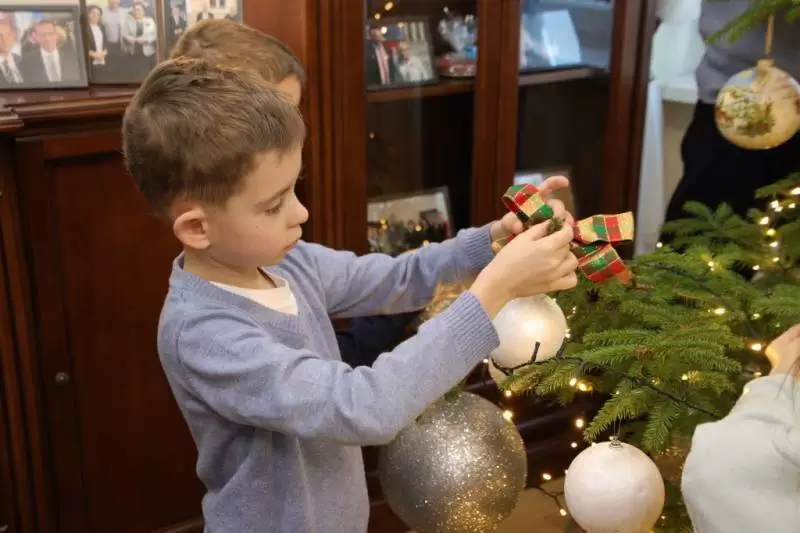 Wspólne ubieranie choinki w gabinecie wójta Gminy Udanin