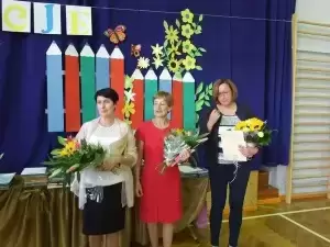 Zakończenie roku to również pożegnania. Grono pedagogiczne podziękowało za lata współpracy paniom: Jolancie Maniowskiej i Jadwidze Semczuk, które od nowego roku szkolnego będą pracować w Szkole Podstawowej w Ujeździe Górnym i pani Jolancie Gradowskiej, która rozpoczyna pracę w Warszawie. Po apelu i spotkaniach w klasach z wychowawcami pełni dobrych humorów wszyscy udali się na zasłużone wakacje.