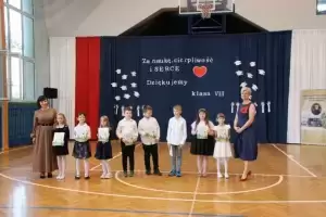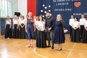 Kolejnym punktem uroczystego zakończenia roku były podziękowania i gratulacje w kierunku uczniów, rodziców i nauczycieli, które skierowała pani Dyrektor Joanna Dumicz, Wójt Gminy Udanin Wojciech Płaziuk oraz Przewodnicząca Rady Rodziców Jolanta Pawłowska. Uczniowie klas od VIII do I za bardzo dobre i celujące wyniki w nauce oraz wzorowe i bardzo dobre zachowanie otrzymali świadectwa z czerwonym paskiem oraz nagrody książkowe ufundowane przez Radę Rodziców.
