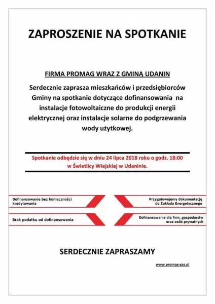 - Firma Promag wraz z Gminą Udanin, serdecznie zapraszają mieszkańców i przedsiębiorców na spotkania dotyczące dofinansowania na instalacje fotowoltaiczne do produkcji energii elektrycznej oraz instalacje solarne do podgrzewania wody użytkowej - informują organizatorzy.