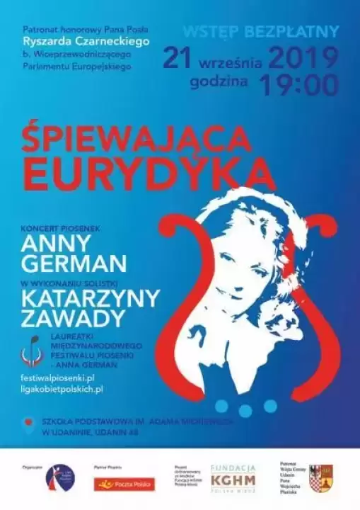 Wójt Gminy Udanin Wojciech Płaziuk zaprasza serdecznie mieszkańców gminy i okolic na niesamowity wieczór z utworami wyjątkowej artystki - piosenkarki Anny German w wykonaniu solistki Katarzyny Zawady.