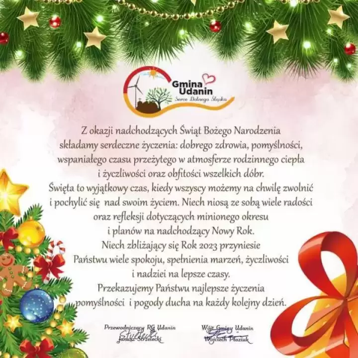 Życzenia świąteczno - noworoczne składają Wójt i Przewodniczący Rady Gminy Udanin