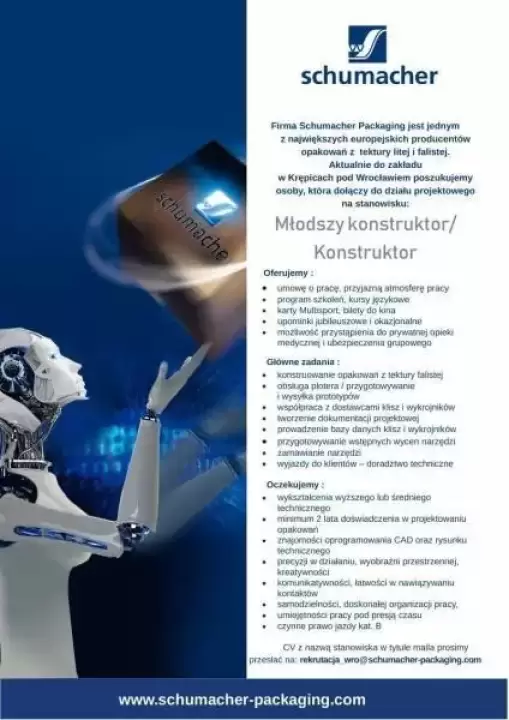 Firma Schumacher Packaging jest jednym z największych europejskich producentów opakowań z tektury litej i falistej. Aktualnie do zakładu w Krępicach pod Wrocławiem poszukujemy osoby, która dołączy do działu projektowego na stanowisku: Młodszy konstruktor/ Konstruktor.
