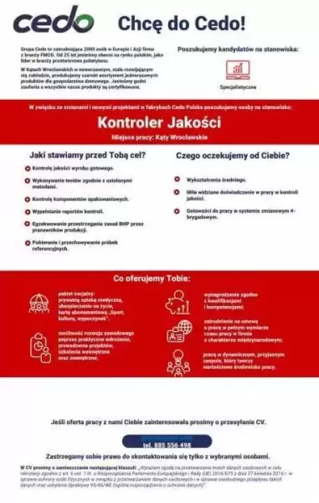W związku ze zmianami i nowymi projektami w fabrykach Cedo Polska poszukujemy osoby na stanowisko: Kontroler Jakości