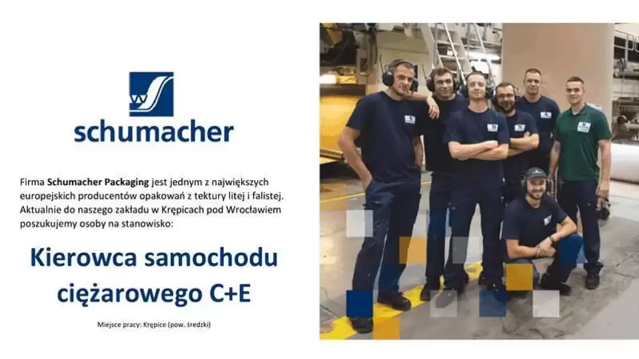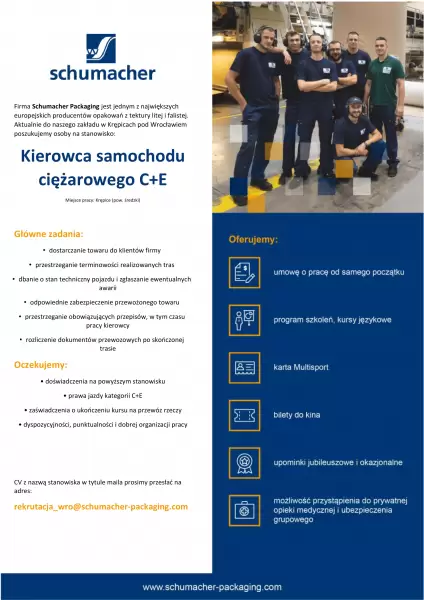 Firma Schumacher Packaging poszukuje osoby na stanowisko: Kierowca samochodu ciężarowego C+E