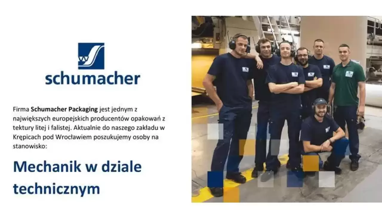 Firma Schumacher Packaging zatrudni osobę na stanowisku Mechanik w dziale technicznym.