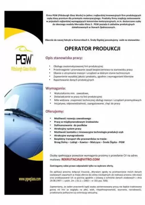 Obecnie do naszej fabryki w Komornikach k. Środy Śląskiej poszukujemy osób na stanowisko: OPERATOR PRODUKCJI