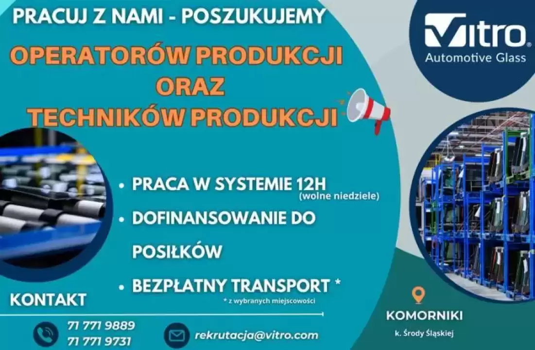 Vitro Automotive Glass poszukuje Operatorów Produkcji oraz Techników Produkcji do pracy w nowoczesnym zakładzie w Komornikach k. Środy Śląskiej