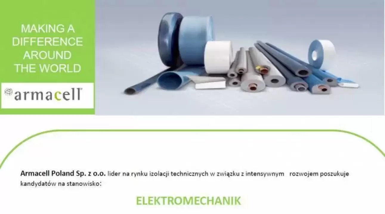 Armacell Poland Sp. z o.o. lider na rynku izolacji technicznych w związku z intensywnym rozwojem poszukuje kandydatów na stanowisko: ELEKTROMECHANIK. Miejsce pracy: Środa Śląska