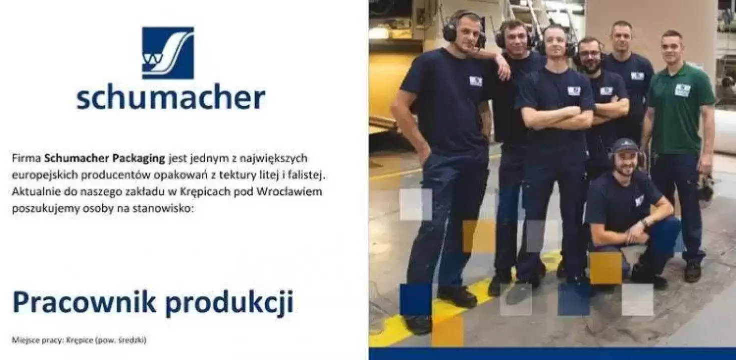 Firma Schumacher Packaging jest jednym z największych europejskich producentów opakowań z tektury litej i falistej. Aktualnie do zakładu w Krępicach pod Wrocławiem poszukuje osoby na stanowisko: PRACOWNIK PRODUKCJI
