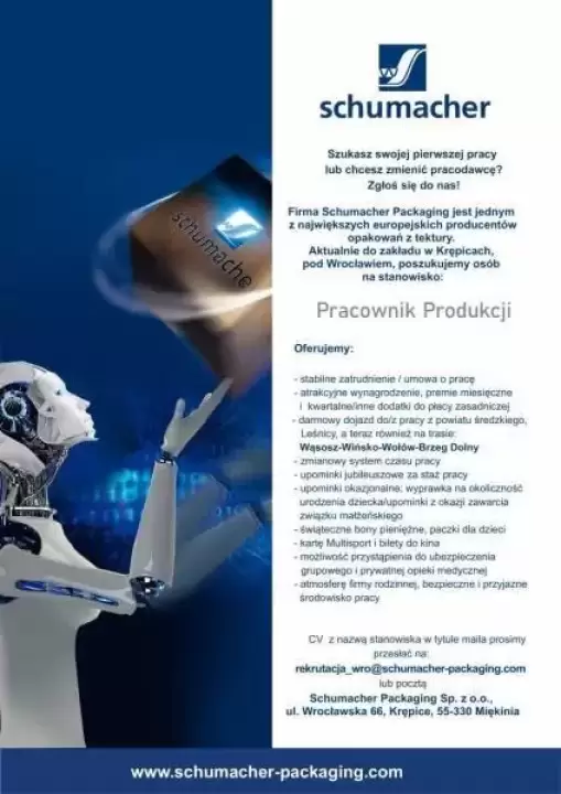 Szukasz swojej pierwszej pracy lub chcesz zmienić pracodawcę? Zgłoś się do nas! Firma Schumacher Packaging jest jednym z największych europejskich producentów opakowań z tektury. Aktualnie do zakładu w Krępicach, pod Wrocławiem, poszukujemy osób na stanowisko: Pracownik Produkcji