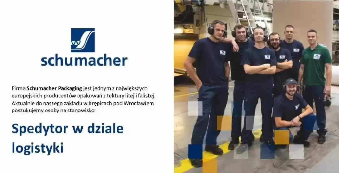 Firma Schumacher Packaging jest jednym z największych europejskich producentów opakowań z tektury litej i falistej. Aktualnie do naszego zakładu w Krępicach pod Wrocławiem poszukujemy osoby na stanowisko: Spedytor w dziale logistyki
