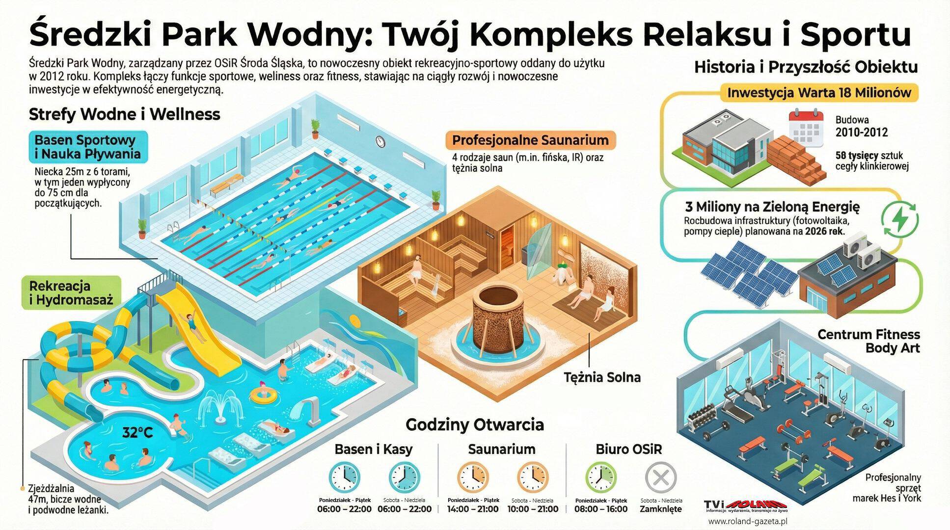 Średzki Park Wodny, zlokalizowany przy ulicy Winogronowej 34 w Środzie Śląskiej, to nowoczesny kompleks sportowo-rekreacyjny, który promuje aktywny styl życia wśród dzieci, młodzieży, dorosłych oraz seniorów. To miejsce, gdzie nowoczesna architektura spotyka się z lokalną historią i ekologicznymi rozwiązaniami.