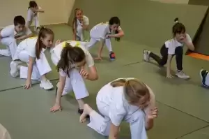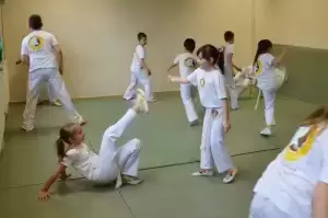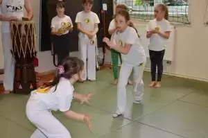 Treningi capoeiry rozpoczynają się od rozgrzewki. Dla dzieci przygotowane są gry i zabawy rozwijające ich sprawność, motorykę, zwinność, szybkość i siłę. - Później robimy gwiazdy, stanie na rękach, kopnięcia, uniki, bo capoeira jest mimo wszystko sztuką walki, a nie tańcem - tłumaczy trener. Kopnięcia są najciekawszą częścią treningu według 8-letniej Mai, która dołączyła do grupy na początku roku i bardzo szybko odnalazła się w tym akrobatycznym sporcie. - Już wcześniej umiałam gwiazdy i szpagaty - dodaje wysportowana uczennica.
