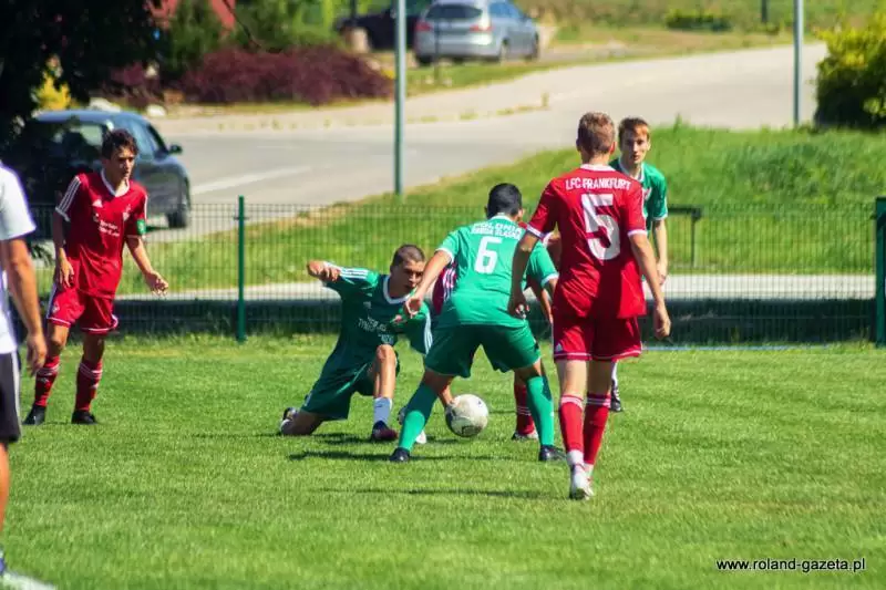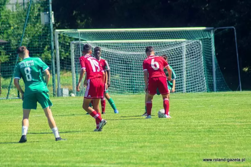 Zawodnicy ze średzkiej drużyny dobrze rozpoczęli mecz. Już na samym początku stworzyli groźną sytuację bramkową. Rozegranie piłki ze środka do prawego pomocnika - dośrodkowanie - główka to akcja, którą ćwiczyli na treningach. Tym razem jednak bramkarz niemieckiej drużyny zdołał wybić piłkę lecącą w światło bramki. Niewiele później gospodarze mogli już cieszyć się z gola. Mateusz Kil posłał precyzyjne dośrodkowanie z rzutu wolnego w pole karne przeciwników, a głową do siatki trafił Radosław Sendyka. Kilkanaście minut później zawodnicy FC Frankfurt wykorzystali błąd gospodarzy w rozegraniu, a ich kontratak okazał się skuteczny. Przed przerwą goście wyszli na prowadzenie po efektownym strzale zza pola karnego. W drugiej połowie to goście z Frankfurtu przejęli inicjatywę. Strzelili jeszcze 6 bramek i mogli cieszyć się z wysokiego zwycięstwa. Drugiego gola dla Polonii zdobył Jakub Grzegorczyk, po akcji bliźniaczo podobnej do tej z pierwszej połowy - na jego głowę precyzyjnie dośrodkował Mateusz Kil.