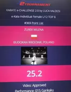 Milena startowała także w bardzo prestiżowym KARATE E-CHALANGE 2.0 by LUCA VALDESI, gdzie w kategorii U-12 zdobyła brązowy medal. Sędziami w tych zawodach byli Mistrzowie Świata i Europy m.in. LUCA VALDESI, DAMIAN QUINTERO czy RIKA USAMI z Japonii.