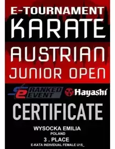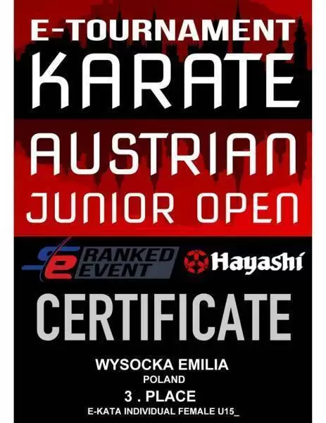 3 miejsce w karegorii U-15 zajęła Emilia Wysocka startująca w Karate Austrian Junior Open, gdzie startowało 784 zawodników z 201 klubów z 46 państw, wygrywając 3 walki eliminacyjne, by w półfinale ulec reprezentantce Francji, która zdobyła najwyższe miejsce na podium.